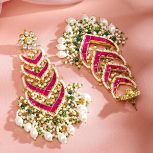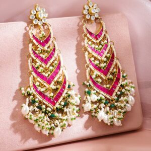 Make a statement with these 24K gold-plated handcrafted shoulder duster earrings, featuring ruby pink Kundan, green & pearl bead embellishments in an intricate layered design, perfect for weddings & festive occasions. Occasion : Bring your style to a whole new level with this handcrafted piece of jewellery. When you’re celebrating a special Occasion : – a birthday, wedding, or personal milestone – this piece adds that extra something that makes us feel special and looking our best. Material : & Care Dimension : Length : 13 cm, Width: 4 cm Net Weight: 83 g Net Quantity : 1 Pair Of Earrings Material :Brass Care Label : It is advisable to avoid contact with water and organic chemicals i.e. perfume sprays. Store jewellery in airtight box. After use, wipe the jewellery with soft cotton cloth.