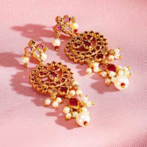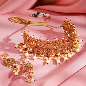 Jewellery Set : This exquisite 24K gold-plated choker necklace set features vibrant ruby stones intricately studded in an ornate design, accented with delicate white pearl beads. The regal craftsmanship and traditional aesthetic make this set a perfect choice for grand occasions, adding a touch of heritage and elegance to your ensemble. Occasion : Bring your style to a whole new level with this handcrafted piece of jewellery. When you’re celebrating a special Occasion : – a birthday, wedding, or personal milestone – this piece adds that extra something that makes us feel special and looking our best. Material : & Care Dimension : Necklace : 18 cm, Earrings : 6 cm Dimension : Net Weight: 81.14 g Net Quantity : 1 Necklace & 2 Earrings Material :Brass Care Label : It is advisable to avoid contact with water and organic chemicals i.e. perfume sprays. Store jewellery in airtight box. After use, wipe the jewellery with soft cotton cloth.