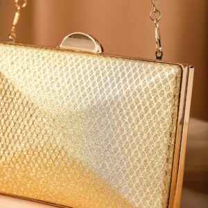 Clutches : Exude elegance with this 24K gold-tone shimmery glossy box clutch, featuring a luxe textured finish, secure clasp closure, and detachable chain strap. A statement piece for evening glamour and special occasions. Occasion : Bring your style to a whole new level with this handcrafted piece of jewellery. When you’re celebrating a special Occasion : – a birthday, wedding, or personal milestone – this piece adds that extra something that makes us feel special and looking our best. Material : & Care Dimension : Length : 12 cm, Width: 5 cm Net Weight: 120 g Net Quantity : 1 Clutches Care Label : It is advisable to avoid contact with water and organic chemicals i.e. perfume sprays. Store jewellery in airtight box. After use, wipe the jewellery with soft cotton cloth.