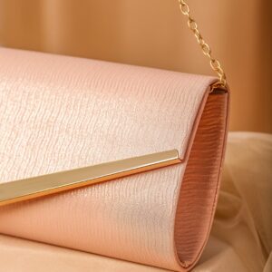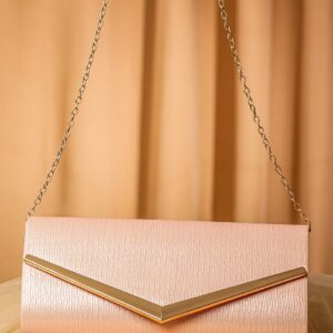 Clutches : Radiate elegance with this blush pink shimmery glossy envelope clutch, featuring a sleek 24K gold-tone V-shaped accent and a detachable chain strap. A luxurious statement for evening glamour. Occasion : Bring your style to a whole new level with this handcrafted piece of jewellery. When you’re celebrating a special Occasion : – a birthday, wedding, or personal milestone – this piece adds that extra something that makes us feel special and looking our best. Material : & Care Dimension : Length : 25 cm, Width: 8 cm Net Weight: 150 g Net Quantity : 1 Clutches Material :Brass Care Label : It is advisable to avoid contact with water and organic chemicals i.e. perfume sprays. Store jewellery in airtight box. After use, wipe the jewellery with soft cotton cloth.