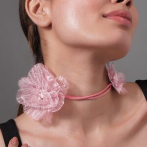 Necklace & Chains : This elegant choker from features two delicate pink flowers made from soft fabric, intricately attached to a smooth double rope. The subtle pink tones and minimalistic design make this choker a perfect accessory for adding a touch of femininity to any look. Occasion : Bring your style to a whole new level with this handcrafted piece of jewellery. When you’re celebrating a special Occasion : – a birthday, wedding, or personal milestone – this piece adds that extra something that makes us feel special and looking our best. Material : & Care Dimension : Size : Length : 18 cm, Width : 10 cm Material : Fabric Care Label : It is advisable to avoid contact with water and organic chemicals i.e. perfume sprays. Store jewellery in airtight box. After use, wipe the jewellery with soft cotton cloth.