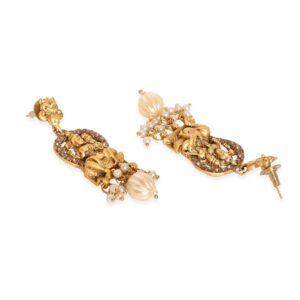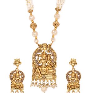 Divine Union” necklace set, inspired by the revered temple jewellery of Lord Shiva and Parvathi. This enchanting ensemble features a pendant intricately designed to depict the divine couple, capturing their eternal love and spiritual significance. The pendant gracefully hangs from a chain adorned with delicate white beads, symbolizing purity and devotion. Material & Care Dimension : Necklace : 60 cm Earrings : 6.5 cm Material : Brass Care Label : It is advisable to avoid contact with water and organic chemicals i.e. perfume sprays. Store jewellery in airtight box. After use, wipe the jewellery with soft