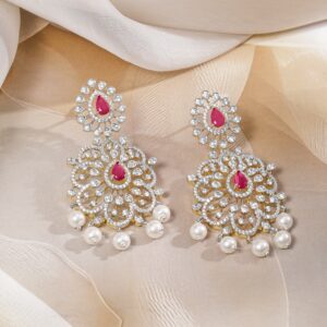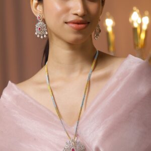 Necklace Set : This dual-tone plated necklace set features a grand pendant with ruby pink stones, dazzling cubic zirconia, and white pearl hangings. A statement festive & wedding essential for women & girls. Occasion : Bring your style to a whole new level with this handcrafted piece of jewelry. When you’re celebrating a special Occasion : – a birthday, wedding, festive or personal milestone – this piece adds that extra something that makes us feel special and looking our best. Material & Care Dimension : Length : NS = 37 cm ; E = 3.2 cm Width: NS = 1.3 cm ; E = 1.3 cm Material: Brass Net Weight: 65 Gram Net Quantity: 1 Necklace & 1 Pair of Earrings Care Label: It is advisable to avoid contact with water and organic chemicals i.e. perfume sprays. Store jewellery in airtight box. After use, wipe the jewellery with soft cotton cloth.