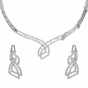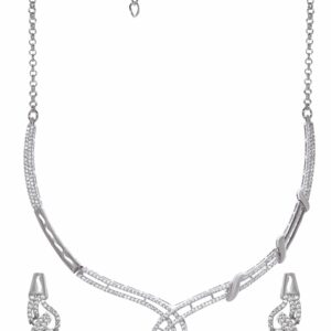 Adorn yourself with the eternal sparkle of this stunning jewelry set, meticulously crafted and rhodium plated for enduring beauty. The set features brilliant zirconia stones that radiate glamour and sophistication. Rhodium plating enhances the shine, creating a piece that is both timeless and contemporary. Material & Care Dimension : Necklace : 18 cm Earrings : 3.5 cm Material: Brass Net Weight: 21.09 Gram Net Quantity: 1 Necklace & 1 Pair of Earrings Care Label: It is advisable to avoid contact with water and organic chemicals i.e. perfume sprays. Store jewellery in airtight box. After use, wipe the jewellery with soft cotton cloth.