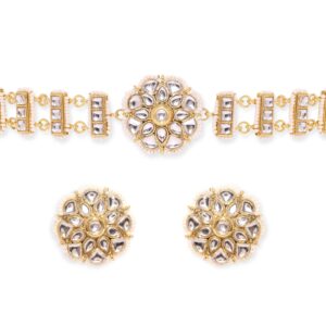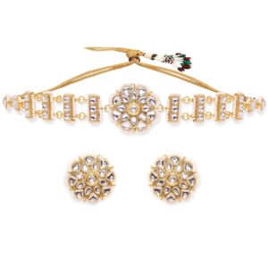 This opulent choker set is a testament to luxury and artistry. Make an unforgettable statement with this exquisite masterpiece, destined to leave a lasting impression of ethereal elegance. Material & Care Dimension : Necklace : 28 cm Earrings : 6 cm Material : Brass Weight : 50g Net Qnty : 1 Necklace, 1 Pair of Earrings Care Label : It is advisable to avoid contact with water and organic chemicals i.e. perfume sprays. Store jewellery in airtight box. After use, wipe the jewellery with soft cotton cloth.