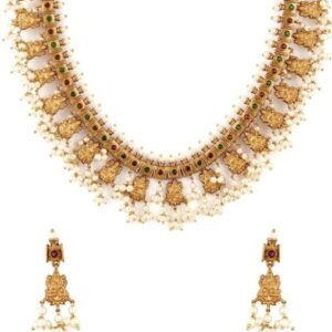It’s a jewellery set fit for the queens! Exude the royal vibe with this stone studded jewellery set. Consisting of a necklace, matching earrings, this necklace set is crafted from gold-plated brass, stones and beads. Occasion : Bring your style to a whole new level with this handcrafted piece of jewellery. When you’re celebrating a special Occasion : – a birthday, wedding, or personal milestone – this piece adds that extra something that makes us feel special and looking our best. Material : & Care¬† Dimension : Necklace 18 cm; Earrings 6 cm Material : ¬†Copper Care Label : It is advisable to avoid contact with water and organic chemicals i.e. perfume sprays. Store jewellery in airtight box. After use, wipe the jewellery with soft cotton cloth