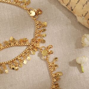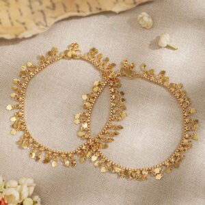 Anklet : Make a statement of glamour with our gilded splendor €“ the 22K gold-plated linked chain anklet. This anklet is a dazzling accessory that beautifully adorns your ankles with sophistication and style. Occasion : Bring your style to a whole new level with this handcrafted piece of jewellery. When you’re celebrating a special Occasion : – a birthday, wedding, or personal milestone – this piece adds that extra something that makes us feel special and looking our best. Material : & Care Dimension : Length : 27 cm, Width : 2 cm Material: Brass Net Weight: 45.9 Gram Net Quantity: 1 Pair of Earrings Care Label: It is advisable to avoid contact with water and organic chemicals i.e. perfume sprays. Store jewellery in airtight box. After use, wipe the jewellery with soft cotton cloth.
