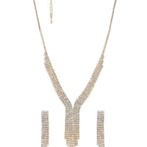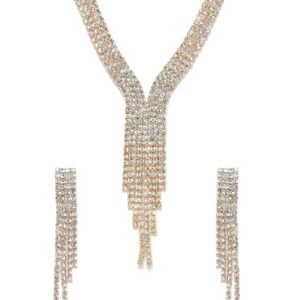 Complementing the necklace are stunning earrings that perfectly accentuate any outfit, be it for a special occasion or a night out on the town. The delicate zircon stones elegantly dangle, reflecting the wearer’s elegance and grace. Material : & Care Dimension : Necklace Length: 26 cm Earrings Length: 6 cm Material : Alloy Care Label : It is advisable to avoid contact with water and organic chemicals i.e. perfume sprays. Store jewellery in airtight box. After use, wipe the jewellery with soft cotton cloth.