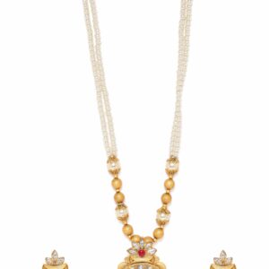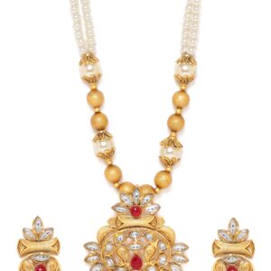 The pendant, meticulously designed with intricate detailing, exudes a touch of opulence and elegance. The sparkling small stones add a subtle shimmer, enhancing the overall beauty of this exquisite piece. Elevate your style with this necklace set, as it effortlessly combines sophistication and charm, becoming a stunning focal point for any occasion. Material & Care Dimension : Necklace: 50 cm; Earrings: 4 cm Material: Alloy Net Weight: 56.55 Gram Net Quantity: 1 Necklace & 1 Pair of Earrings Care Label: It is advisable to avoid contact with water and organic chemicals i.e. perfume sprays. Store jewellery in airtight box. After use, wipe the jewellery with soft cotton cloth.