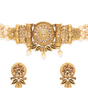 Choker set, combining a captivating gold pendant, luminous white pearls, and a delicate chain adorned with dainty white beads. The intricately designed gold pendant takes center stage, featuring a mesmerizing blend of elegance and sophistication. Suspended from the pendant are exquisite white pearls, their pristine beauty adding a touch of timeless charm. Occasion : Bring your style to a whole new level with this handcrafted piece of jewellery. When you’re celebrating a special Occasion : – a birthday, wedding, or personal milestone – this piece adds that extra something that makes us feel special and looking our best. Material & Care Dimension : Necklace : 25 cm Earrings : 4.5 cm Material: Brass Net Weight: 67.9 Gram Net Quantity: 1 Necklace & 1 Pair of Earrings Care Label: It is advisable to avoid contact with water and organic chemicals i.e. perfume sprays. Store jewellery in airtight box. After use, wipe the jewellery with soft cotton cloth.