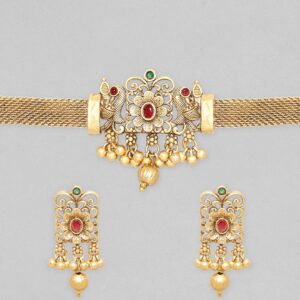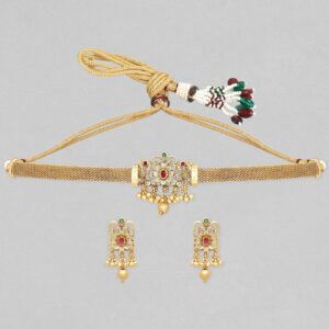 It’s a jewellery set fit for the queens! Exude the royal vibe with this stone studded jewellery set. Consisting of a necklace, matching earrings, this necklace set is crafted from gold-plated brass, stones and beads. Occasion : Bring your style to a whole new level with this handcrafted piece of jewellery. When you’re celebrating a special Occasion : – a birthday, wedding, or personal milestone – this piece adds that extra something that makes us feel special and looking our best. Material & Care Dimension : Choker 21 cm; Earring 3.1 cm Material : Brass Collection : Rajwadi Gold Care Label : It is advisable to avoid contact with water and organic chemicals i.e. perfume sprays. Store jewellery in airtight box. After use, wipe the jewellery with soft cotton cloth