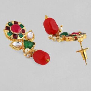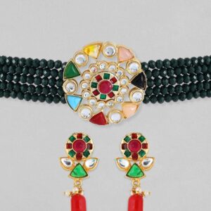 Necklace Set : This exquisite & is crafted from gold-plated material and showcases stone-studded jewellery details. The elegant green color adds a timeless touch, perfect for special occasions. Complete your look with this stunning piece. Occasion : Bring your style to a whole new level with this handcrafted piece of jewellery. When you’re celebrating a special Occasion : – a birthday, wedding, or personal milestone – this piece adds that extra something that makes us feel special and looking our best. Material : & Care Dimension : Size: Necklace: 19.3 cm Earrings: 4.4 cm Material: Brass Net Weight: 50 Gram Net Quantity: 1 Necklace & 1 Pair of Earrings Care Label: It is advisable to avoid contact with water and organic chemicals i.e. perfume sprays. Store jewellery in airtight box. After use, wipe the jewellery with soft cotton cloth.