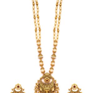 It’s a jewellery set fit for the queens! Exude the royal vibe with this stone studded jewellery set. Consisting of a necklace, matching earrings, this necklace set is crafted from gold-plated brass, stones and beads. Occasion : Bring your style to a whole new level with this handcrafted piece of jewellery. When you’re celebrating a special Occasion : – a birthday, wedding, or personal milestone – this piece adds that extra something that makes us feel special and looking our best. Material : & Care Dimension : Necklace – 60 cm ,Earrings- 5.9 cm Material : ¬†Brass Care Label : It is advisable to avoid contact with water and organic chemicals i.e. perfume sprays. Store jewellery in airtight box. After use, wipe the jewellery with soft cotton cloth