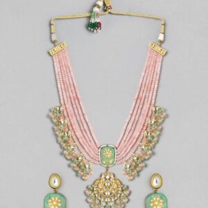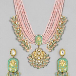 A necklace set with an evergreen design, this set is a mix of enamel beauties, famous Kundan work, and the magic of beads. The necklace has a pendant with enamel and Kundan work that is emphasised by the pink and green beads. The pink beads tying the gold plated necklace together make for an elegant element. Occasion: A grand necklace with long kundan earrings that can be worn to weddings or any festivals. Material : & Care Dimension :   Necklace: 49 cm; Earrings: 6.8 cm Material :Copper Care Label : It is advisable to avoid contact with water and organic chemicals i.e. perfume sprays. Store jewellery in airtight box. After use, wipe the jewellery with soft cotton cloth