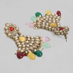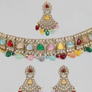 it’s a Choker Set fit for the queens! Exude the royal vibe with this stone studded Choker Set. Consisting of a necklace, matching earrings, this Choker Set is crafted from gold-plated brass,¬† . Occasion : Bring your style to a whole new level with this handcrafted piece of jewellery. When you’re celebrating a special Occasion : – a birthday, wedding, or personal milestone – this piece adds that extra something that makes us feel special and looking our best. Material & Care Dimension :¬†Necklace: 52 cm; Earrings: 6.6 cm¬†¬†Maangtikka: 14.5 cm Material :¬† Copper Care Label : It is advisable to avoid contact with water and organic chemicals i.e. perfume sprays. Store jewellery in airtight box. After use, wipe the jewellery with soft cotton cloth.