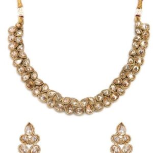 It’s a jewellery set fit for the queens! Exude the royal vibe with this stone studded jewellery set. Consisting of a necklace, matching earrings, this necklace set is crafted from gold-plated brass, stones and beads. Occasion : Bring your style to a whole new level with this handcrafted piece of jewellery. When you’re celebrating a special Occasion : – a birthday, wedding, or personal milestone – this piece adds that extra something that makes us feel special and looking our best. Material : & Care Dimension : Length Necklace – 32 cm & Earrings 3 cm Material : Brass Care Label : It is advisable to avoid contact with water and organic chemicals i.e. perfume sprays. Store jewellery in airtight box. After use, wipe the jewellery with soft cotton cloth.
