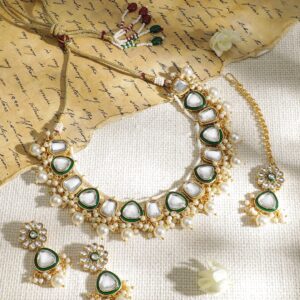 Jewellery Set: One of the most versatile forms of ornate designs that goes well with every style and personality. Wear one of these and you do not have to worry about any other accessory. Occasion : Bring your style to a whole new level with this handcrafted piece of jewellery. When you’re celebrating a special Occasion : – a birthday, wedding, or personal milestone – this piece adds that extra something that makes us feel special and looking our best. Material : & Care Dimension :Size : Necklace : 30 cm, Earrings : 3 cm, Maang Tikka : 15 cm Material :Alloy Weight : 55g Net Qnty : 1 Necklace, 1 Pair of Earrings, 1 Maang Tikka Care Label : It is advisable to avoid contact with water and organic chemicals i.e. perfume sprays. Store jewellery in airtight box. After use, wipe the jewellery with soft cotton cloth.