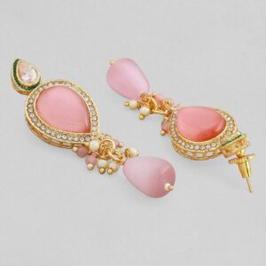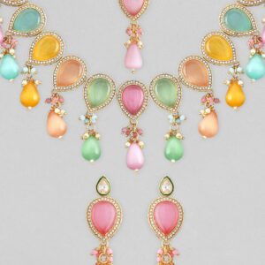 It’s a jewellery set fit for the queens! Exude the royal vibe with this stone studded jewellery set. Consisting of a necklace, matching earrings, this necklace set is crafted from gold-plated brass, stones and beads. Occasion : Bring your style to a whole new level with this handcrafted piece of jewellery. When you’re celebrating a special Occasion : – a birthday, wedding, or personal milestone – this piece adds that extra something that makes us feel special and looking our best. Material : & Care Dimension : Necklace – 21.4 cm ,Earrings- 6.2 cm , Maangtikka – 14.2 cm Collection : Kundan(Gold) Material: Brass Net Weight: 113 Gram Net Quantity: 1 Necklace, 1 Pair of Earrings, 1 Maang Tikka Care Label: It is advisable to avoid contact with water and organic chemicals i.e. perfume sprays. Store jewellery in airtight box. After use, wipe the jewellery with soft cotton cloth.