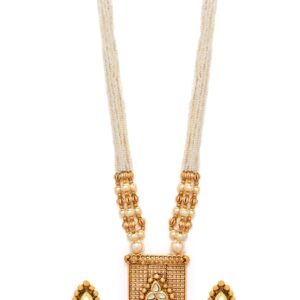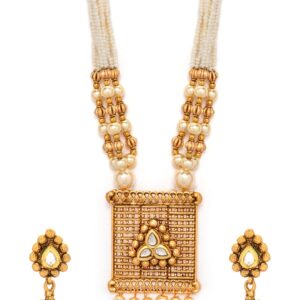It’s a jewellery set fit for the queens! Exude the royal vibe with this stone studded jewellery set. Consisting of a necklace, matching earrings, this necklace set is crafted from gold-plated brass, stones and beads. Occasion : Bring your style to a whole new level with this handcrafted piece of jewellery. When you’re celebrating a special Occasion : – a birthday, wedding, or personal milestone – this piece adds that extra something that makes us feel special and looking our best. Material : & Care Dimension : Necklace – 53.3 cm ,Earrings- 4.4 cm Material : ¬†Brass Care Label : It is advisable to avoid contact with water and organic chemicals i.e. perfume sprays. Store jewellery in airtight box. After use, wipe the jewellery with soft cotton cloth