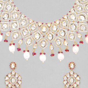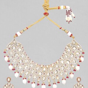 A bridal necklace is set to complete the look on any day revolving around the wedding. This necklace set has red elements to ensure the bride stands out. The polki work and the inclusion of bold pearls at the end of the necklace make it look like the complete package. The shimmering American diamonds and the stunning white stones are the roots of the classy bridal look. Occasion: Any occasion like sangeet, mehendi, reception, engagement, or even the perfect choice for D-day! s feel special and looking our best. Material : & Care Dimension : Necklace 19 cm; Earring 7 cm: Material : Copper Collection : Polki(Gold) Weight : 126g Net Qnty : 1 Necklace, 1 Pair of Earrings Care Label : It is advisable to avoid contact with water and organic chemicals i.e. perfume sprays. Store jewellery in airtight box. After use, wipe the jewellery with soft cotton cloth.