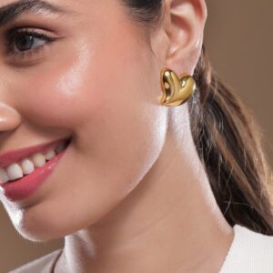 Earrings : These 18K gold-plated heart-shaped stud earrings are crafted from tarnish-free and waterproof stainless steel. Their smooth, sculpted design adds a touch of romance and elegance, making them a perfect choice for any occasion. Occasion : Bring your style to a whole new level with this handcrafted piece of jewellery. When you’re celebrating a special Occasion : – a birthday, wedding, or personal milestone – this piece adds that extra something that makes us feel special and looking our best. Material : & Care Dimension : Size : Length : 3 cm, Width : 2.5 cm Material :Stainless steel Care Label : It is advisable to avoid contact with water and organic chemicals i.e. perfume sprays. Store jewellery in airtight box. After use, wipe the jewellery with soft cotton cloth.