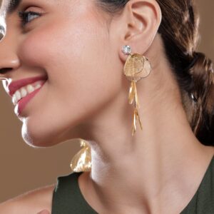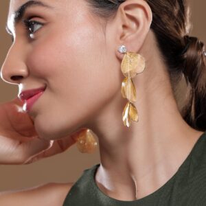 Earrings : These 18K gold-plated earrings feature a cascading leaf design, crafted with intricate detailing to create a natural and elegant look. The lightweight, flowing form adds a touch of sophistication, making them a perfect accessory for both casual and formal occasions. Occasion : Bring your style to a whole new level with this handcrafted piece of jewellery. When you’re celebrating a special Occasion : – a birthday, wedding, or personal milestone – this piece adds that extra something that makes us feel special and looking our best. Material : & Care Dimension : Size : Length : 9 cm, Width : 2.9 cm Material :Brass Net Weight : 9.05g Net Qty : 1 Pair Care Label : It is advisable to avoid contact with water and organic chemicals i.e. perfume sprays. Store jewellery in airtight box. After use, wipe the jewellery with soft cotton cloth.