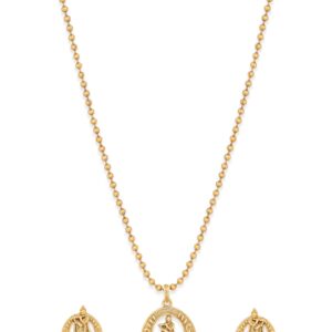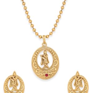 This enchanting piece showcases a pristine Lord Krishna idol pendant, exuding grace and serenity. Crafted with utmost reverence, the minimalist design allows the divine presence of Lord Krishna to shine, symbolizing love, compassion, and transcendence. Suspended from a delicate chain, this necklace set serves as a profound reminder of devotion and spirituality Occasion : Bring your style to a whole new level with this handcrafted piece of jewellery. When you’re celebrating a special Occasion : – a birthday, wedding, or personal milestone – this piece adds that extra something that makes us feel special and looking our best. Material & Care Dimension : Necklace : 50 cm Earrings : 3.5 cm Material: Brass Net Weight: 40.5 Gram Net Quantity: 1 Necklace & 1 Pair of Earrings Care Label: It is advisable to avoid contact with water and organic chemicals i.e. perfume sprays. Store jewellery in airtight box. After use, wipe the jewellery with soft cotton cloth.