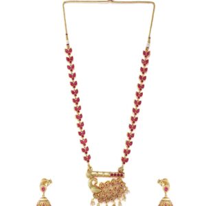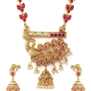 It’s a jewellery set fit for the queens! Exude the royal vibe with this stone studded jewellery set. Consisting of a necklace, matching earrings, this necklace set is crafted from gold-plated brass, stones and beads. Occasion : Bring your style to a whole new level with this handcrafted piece of jewellery. When you’re celebrating a special Occasion : – a birthday, wedding, or personal milestone – this piece adds that extra something that makes us feel special and looking our best. Material : & Care Dimension : Necklace – 54 cm ,Earrings – 5 cm Material : ¬†Brass Care Label : It is advisable to avoid contact with water and organic chemicals i.e. perfume sprays. Store jewellery in airtight box. After use, wipe the jewellery with soft cotton cloth