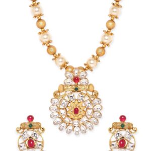 The set features a striking gold-toned pendant adorned with captivating stones, reflecting the mesmerizing colors of the dawn. The pendant gracefully suspends from a chain embellished with a combination of golden and off-white pearls, creating a harmonious contrast that exudes elegance and sophistication. Occasion : Bring your style to a whole new level with this handcrafted piece of jewellery. When you’re celebrating a special Occasion : – a birthday, wedding, or personal milestone – this piece adds that extra something that makes us feel special and looking our best. Material & Care Dimension : Necklace : 50 cm Earrings : 4 cm Material: Brass Net Weight: 64,06 Gram Net Quantity: 1 Necklace & 1 Pair of Earrings Care Label: It is advisable to avoid contact with water and organic chemicals i.e. perfume sprays. Store jewellery in airtight box. After use, wipe the jewellery with soft cotton cloth.