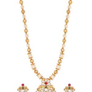 Gold-Toned Pendant with Dazzling Stones and Golden Off-White Pearls Chain Necklace Set – Gold