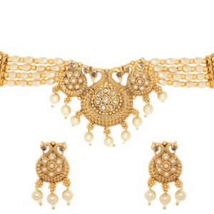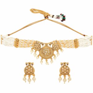 Immerse yourself in the serene beauty of our “Whispering Sands” choker set, where a gold-toned pendant takes center stage on a delicate chain adorned with off-white beads. The pendant, crafted with intricate details, emanates a sense of refined elegance and captures the essence of gentle whispers carried by the sands. Material & Care Dimension : Necklace Length: 14 cm Earrings Length: 3 cm Material : Alloy Net Weight: 53.07 Gram Net Quantity: 1 Necklace & 1 Pair of Earrings Care Label: It is advisable to avoid contact with water and organic chemicals i.e. perfume sprays. Store jewellery in airtight box. After use, wipe the jewellery with soft cotton cloth.