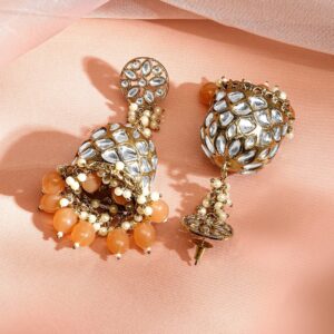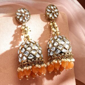 Elevate your jewelry collection with these 22K gold-plated dome-shaped jhumka earrings, handcrafted with intricate Kundan work and adorned with peach and pearl beads for a refined, traditional look. Occasion : Bring your style to a whole new level with this handcrafted piece of jewellery. When you’re celebrating a special Occasion : – a birthday, wedding, festive or personal milestone – this piece adds that extra something that makes us feel special and looking our best. Material & Care Dimension : Length : 10.3 cm Material : Brass Net Quantity : 1 Pair of Earrings Net Weight : 70 Gram Material : Kundan Care Label : It is advisable to avoid contact with water and organic chemicals i.e. perfume sprays. Store jewellery in airtight box. After use, wipe the jewellery with soft cotton cloth.