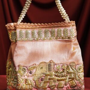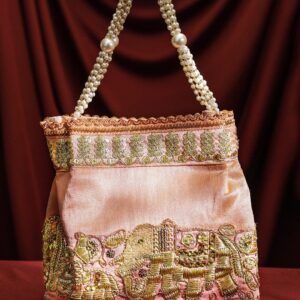 Be the first to review “Handcrafted Peach Pink Silk Potli Bag with Pearl Handle & Gold Embroidered Elephant Motif”