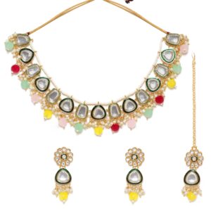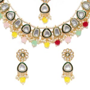 The intricate Kundan work shimmers with radiant beauty, while the diverse array of colourful beads adds a playful and joyful touch. This captivating ensemble effortlessly combines traditional elegance with a burst of lively hues, making it a statement accessory that will elevate your style and evoke a sense of celebration wherever you go. Material & Care Dimension : Necklace : 21 cm Earrings : 5 cm Material : Brass Care Label : It is advisable to avoid contact with water and organic chemicals i.e. perfume sprays. Store jewellery in airtight box. After use, wipe the jewellery with soft