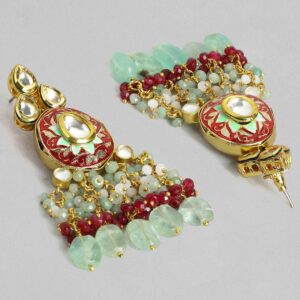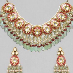 This traditional set with a modern twist consists of a 24K gold-plated body. The red and green beads are a part of the necklace that has been handcrafted with utmost importance and attention to detail. The White stone centre between each part of the red and green enamelled teardrop-shaped part comes together to form this magnificent piece. The earrings add more life to this lively piece. Occasion: A necklace set that will shine best at outdoor parties, mehendi, baby showers, birthdays, anniversaries, lunches, or early evening tea parties. Material : & Care Dimension : Necklace 27 cm; Earrings 8.5 cm Material :    Copper Care Label : It is advisable to avoid contact with water and organic chemicals i.e. perfume sprays. Store jewellery in airtight box. After use, wipe the jewellery with soft cotton cloth