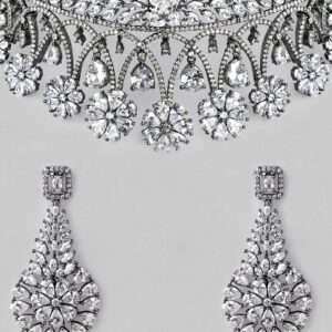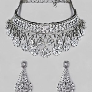 A piece of the bygone era, this vintage set has a body of oxidised silver and is embedded with white stones. This handcrafted beauty has a beautiful design that eliminates the need for another necklace. The choker looks like an inverted tiara and is fit for a queen. The chandelier earrings are just as regal and set you a class apart. Occasion: Perfect for when you are getting ready for a big fat Indian wedding. Material & Care Dimension : Necklace 28.6 cm ,Earrings 5.5 cm Material : Copper Care Label : It is advisable to avoid contact with water and organic chemicals i.e. perfume sprays. Store jewellery in airtight box. After use, wipe the jewellery with soft cotton cloth.