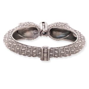 Adorn your wrist with the regal charm of this oxidized silver plated Kada bracelet featuring an exquisite peacock motif. The intricate design pays homage to the graceful beauty of the peacock, making it a statement piece for any occasion. Material & Care Dimension :Free Size Material : Brass Care Label : It is advisable to avoid contact with water and organic chemicals i.e. perfume sprays. Store jewellery in airtight box. After use, wipe the jewellery with soft cotton cloth.