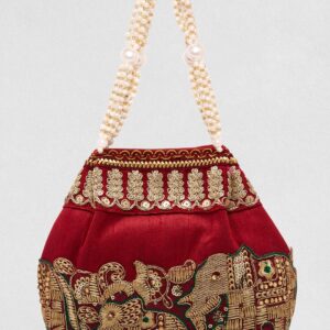 This elegant potli handbag from is crafted from Maroon Coloured fabric with intricate Silver embroidery and pearl accents for a classic, sophisticated look. It’s a perfect accessory for any special event. The Maroon Coloured Potli Handbag is attractive and chic. Its exterior is detailed with intricate silver embroidery and pearls, and adorned with an elegant elephant design. A perfect statement piece for any occasion. potli bag with the embellishment of stones and elegant designs to add up to your look while adding the extra shine to the moment. Carry it and complete your look with this timeless classic accessory by . Material & Care Size/Length : 16 cm Width: 17 cm Depth : 7.5 cm Weight (G): 220 G Material: Fabric Collection: Gold Embroider Net Qnty : 1 Handbag