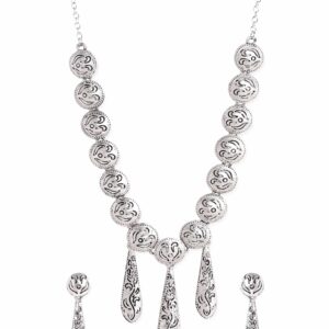 Elevate your style with the Mystic Radiance Jewelry Set, where the artistry of oxidized silver-plated beads meets modern design. Unveil a world of sophistication and versatility as you adorn yourself with this timeless and captivating ensemble. Material & Care Dimension : Necklace : 38 cm Earrings : 3 cm Material : Brass Care Label : It is advisable to avoid contact with water and organic chemicals i.e. perfume sprays. Store jewellery in airtight box. After use, wipe the jewellery with soft cotton cloth.