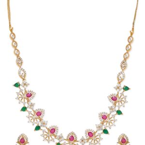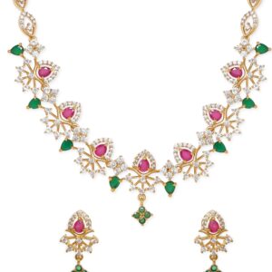 Embrace opulence with our enchanting gold-plated AD and green stone necklace set. The dazzling AD stones dance in harmony with the rich green gemstones, creating a mesmerizing piece of jewelry that exudes luxury and allure. Elevate your style with this exquisite necklace set, a testament to your impeccable taste and sophistication. Material & Care Dimension : Necklace : 22 cm Earrings : 2.5 cm Material: Brass Net Weight: 27.81 Gram Net Quantity: 1 Necklace & 1 Pair of Earrings Care Label: It is advisable to avoid contact with water and organic chemicals i.e. perfume sprays. Store jewellery in airtight box. After use, wipe the jewellery with soft cotton cloth.