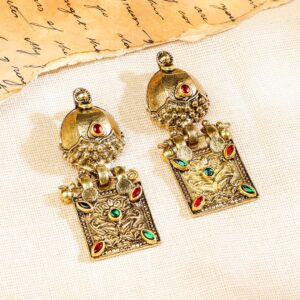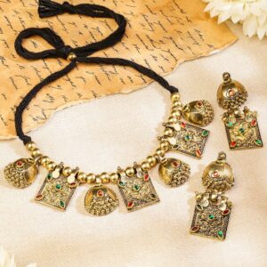 This oxidized antique gold-plated necklace set features alternating dome and square tribal motifs, adorned with red and green stones. Designed for women, it’s perfect for festive, folk, and ethnic occasion wear. Material & Care Dimension : Length – Necklace : 16 cm ; Earrings : 6.5 cm Width – Necklace : 2.5 cm ; Earrings : 2.5 cm Material : Brass Collection : Oxidized Weight : 88.91 Gram Net Qnty : 1 Necklace & 1 Pair of Earrings Care Label : It is advisable to avoid contact with water and organic chemicals i.e. perfume sprays. Store jewellery in airtight box. After use, wipe the jewellery with soft cotton cloth.