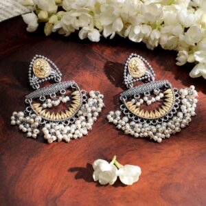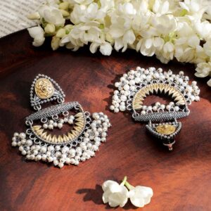 presents oxidized silver and gold dual-tone chandelier earrings with intricate detailing and cascading pearl-like drops. A blend of traditional elegance and modern sophistication. Occasion : Bring your style to a whole new level with this handcrafted piece of jewelry. When you’re celebrating a special Occasion : – a birthday, festive, wedding, or personal milestone – this piece adds that extra something that makes us feel special and looking our best. Material & Care Dimension : Length: 7.5 cm ; Width : 4.5 cm Material : Brass Weight: 44.78 gram Net Quantity : 1 Pair of Earrings Care Label : It is advisable to avoid contact with water and organic chemicals i.e. perfume sprays. Store jewelry in airtight box. After use, wipe the jewellery with soft cotton cloth.