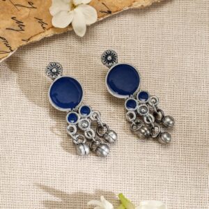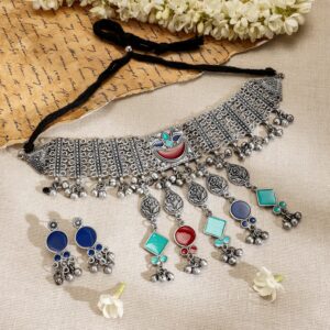 Necklace set: ‘ oxidised silver-plated statement choker set features intricate patterns and vibrant blue, red, and turquoise accents, making it a bold statement piece that enhances any ethnic ensemble. Occasion : Bring your style to a whole new level with this handcrafted piece of jewellery. When you’re celebrating a special Occasion : – a birthday, wedding, or personal milestone – this piece adds that extra something that makes us feel special and looking our best. Material : & Care Dimension :Size : Necklace & Earrings : Length : NS- 24 ; E- 5 cm Width : NS- 12 ; E- 1.5 cm Material : Brass Care Label : It is advisable to avoid contact with water and organic chemicals i.e. perfume sprays. Store jewellery in airtight box. After use, wipe the jewellery with soft cotton cloth.