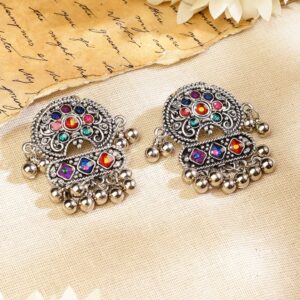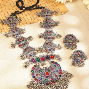 Jewellery Set : This oxidized silver-plated Afghani-style necklace set features multicolor stones, engraved circular motifs, and layered ghungroo detailing. Designed for women, it’s perfect for festive and cultural celebrations with traditional or fusion outfits. Material & Care Length : Necklace : 29 cm ; Earrings : 5 cm Width : Necklace : 8 cm ; Earrings : 4 cm Material: Brass Weight : 200.25 Gram Net Quantity : 1 Necklace and 1 Pair of Earrings Collections : Oxidized Care Instruction : Wipe your jewellery with a soft cloth after every use. Always store your jewellery in a flat box to avoid accidental scratches. Keep sprays and perfumes away from your jewellery. Do not soak your jewellery in water. Clean your jewellery using a soft brush, dipped in jewellery cleaning solution only