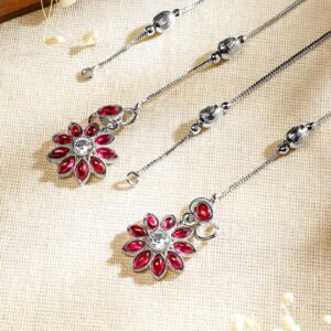 Anklet : A set of 2 oxidised silver-plated anklets, featuring ruby pink and white Kundan floral charms, accentuated with ornate silver bead detailing. Ideal for weddings, festive occasions & traditional wear. Occasion : Bring your style to a whole new level with this handcrafted piece of jewellery. When you’re celebrating a special Occasion : – a birthday, wedding, festive or personal milestone – this piece adds that extra something that makes us feel special and looking our best. Material & Care Dimension : Length : 27 cm Dimension : Width : 2 cm Net Weight : 12.55 Gram Net Quantity : 1 Pair of Anklet Material : Brass Care Label : It is advisable to avoid contact with water and organic chemicals i.e. perfume sprays. Store jewellery in airtight box. After use, wipe the jewellery with soft cotton cloth.