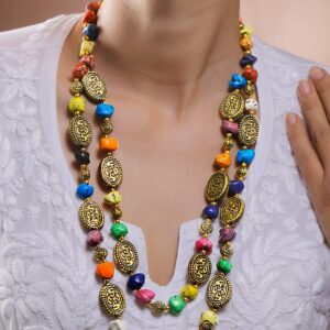 This dual-layer oxidized necklace features turquoise blue raw stone beads paired with antique gold oval tribal discs. A handcrafted bohemian piece ideal for artistic and ethnic dressing. Material & Care Dimension : Necklace : 35 cm ; Width : 2 cm Material: Brass Collection : Beaded Net Weight: 100.83 gram Net Quantity: 1 Necklace Care Label: It is advisable to avoid contact with water and organic chemicals i.e. perfume sprays. Store jewellery in airtight box. After use, wipe the jewellery with soft cotton cloth.