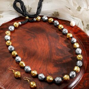 A striking dual-plated necklace featuring oxidized gold and silver beads with matching earrings. The bold statement design adds a unique touch to your traditional and contemporary outfits. Material & Care Dimension : Length – Necklace : 50 cm ; Earrings : 1 cm Width – Necklace : 4 cm ; Earrings : 1 cm Material : Brass Collection : Oxidized Weight : 92.08 Gram Net Qnty : 1 Necklace & 1 Pair of Earrings Care Label : It is advisable to avoid contact with water and organic chemicals i.e. perfume sprays. Store jewellery in airtight box. After use, wipe the jewellery with soft cotton cloth.