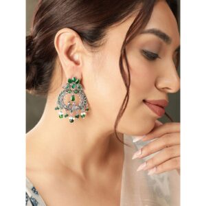 Earrings : These exquisite earrings feature intricately designed oxidized silver adorned with rich emerald green stones and lustrous pearl beads, creating a statement accessory that exudes sophistication. Elevate your look with these unique and eye-catching earrings, perfect for adding a touch of timeless allure to any ensemble. Embrace the fusion of tradition and modernity with this exquisite piece. Occasion : Bring your style to a whole new level with this handcrafted piece of jewellery. When you’re celebrating a special Occasion : – a birthday, wedding, or personal milestone – this piece adds that extra something that makes us feel special and looking our best. Material : & Care Dimension : Length : 6cm, Width : 4cm Material :Alloy Care Label : It is advisable to avoid contact with water and organic chemicals i.e. perfume sprays. Store jewellery in airtight box. After use, wipe the jewellery with soft cotton cloth.