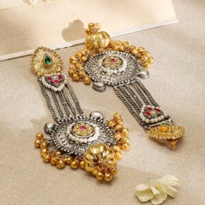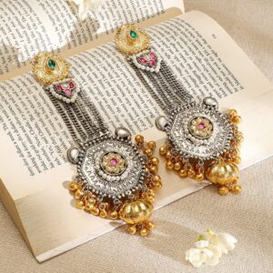 Earrings : oxidized silver and gold-plated long dangle earrings feature ruby, emerald accents, and intricate gold bead detailing, combining elegance with a bold statement style. Material : & Care Dimension : Size : Length : 15 cm, Width : 4 cm Material :Brass Care Label : It is advisable to avoid contact with water and organic chemicals i.e. perfume sprays. Store jewellery in airtight box. After use, wipe the jewellery with soft cotton cloth.