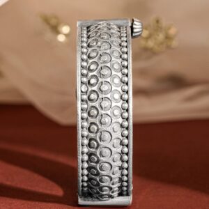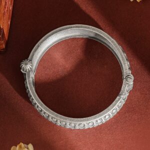 This oxidized silver-plated bangle-style bracelet boasts intricate antique-inspired craftsmanship. A perfect blend of tradition and artistry, it complements both ethnic and casual looks. Occasion : Bring your style to a whole new level with this handcrafted piece of jewellery. When you’re celebrating a special Occasion : – a birthday, wedding, or personal milestone – this piece adds that extra something that makes us feel special and looking our best. Material & Care Dimension : Openable Material : Brass Care Label : It is advisable to avoid contact with water and organic chemicals i.e. perfume sprays. Store jewellery in airtight box. After use, wipe the jewellery with soft cotton cloth.